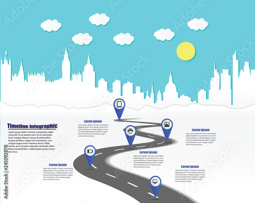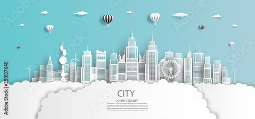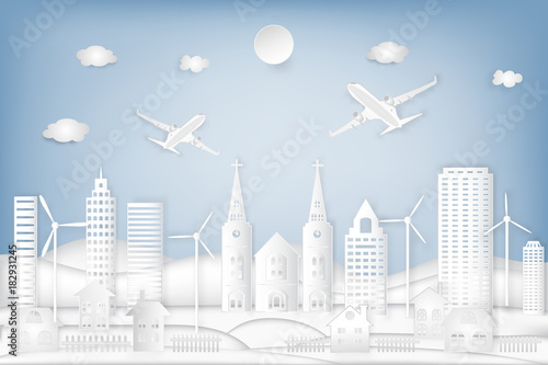 Discover new world web banner template. Vector layered paper cut style sky, airplane and world famous landmarks silhouettes. Worldwide tour, tourism, travel by air.