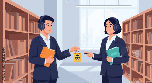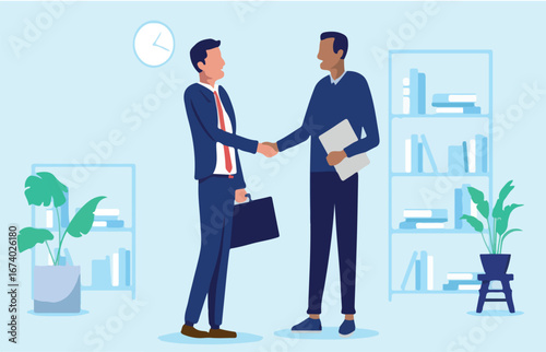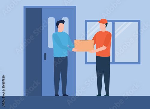 Job losses, unemployment concept vector isolated illustration. Angry boss showing the door to dismissed frustrated man holding box with his personal things. Flat style design.