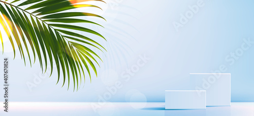 White round display podium, exotic flowers, bamboo, palm tree leaves, vector illustration. Tropical floral background for product advertising poster, banner, flyer etc.