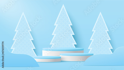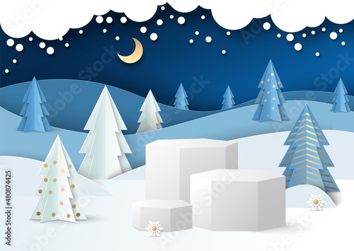 White round display podium mockup, paper cut winter forest landscape, vector illustration. Winter podium for gift, cosmetic product promotion. Season sales poster, banner template.
