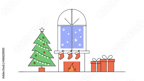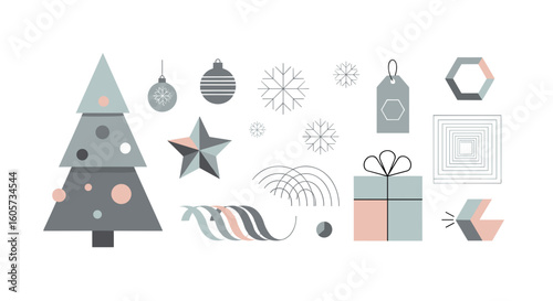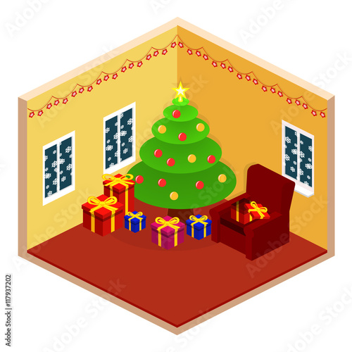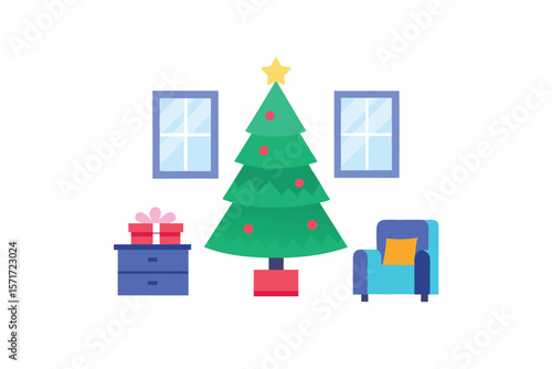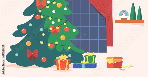 White display podium mockup set with gift boxes, paper cut Christmas tree, decorations, vector illustration. Christmas studio, platform, stand, stage for gift, cosmetic product promotion.