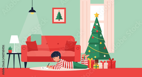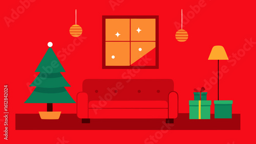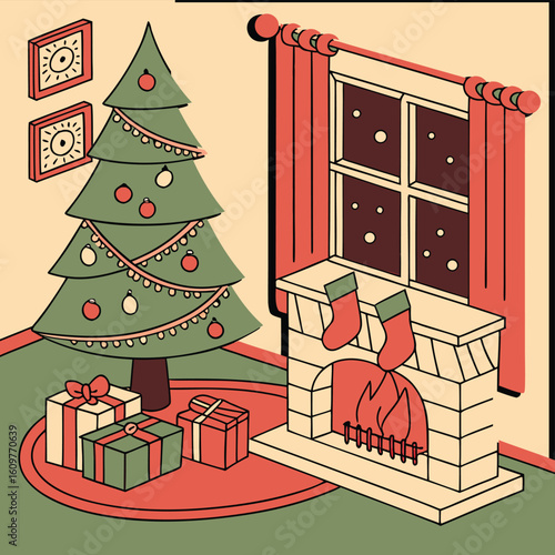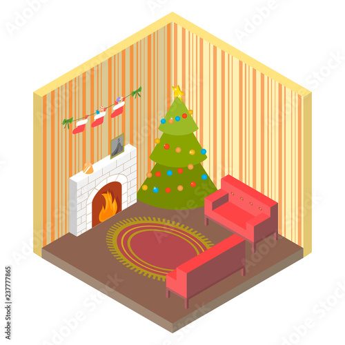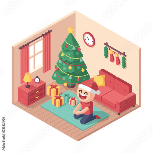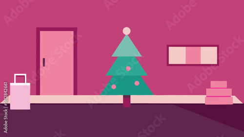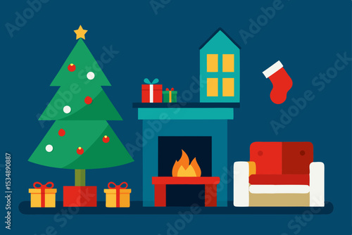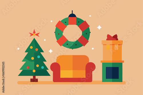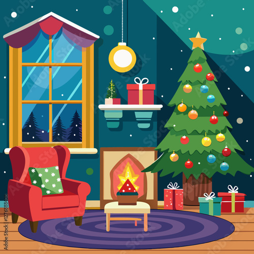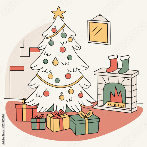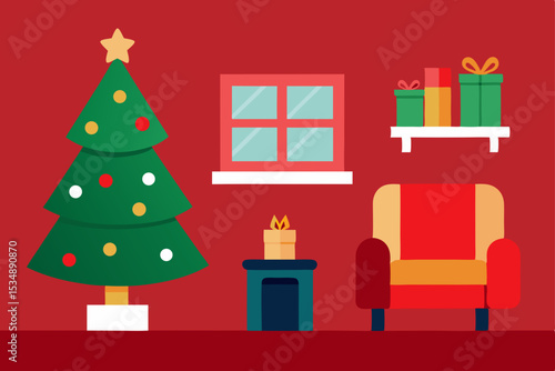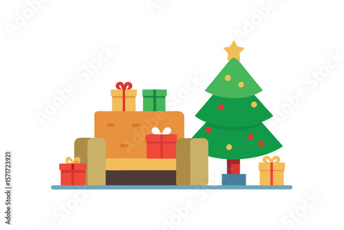 White display podium mockup set with gift boxes, paper cut Christmas tree, decorations, vector illustration. Christmas studio, platform, stand, stage for gift, cosmetic product promotion.