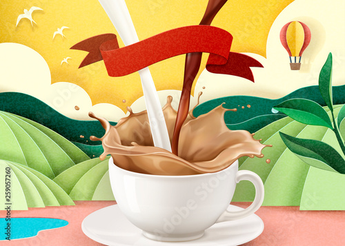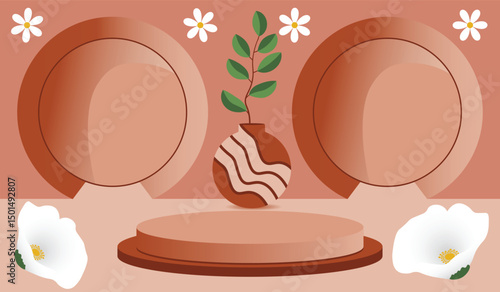 Realistic round display podium, layered paper cut coffee splashes, beans, vector illustration. Coffee background for product advertising poster, banner, flyer etc.