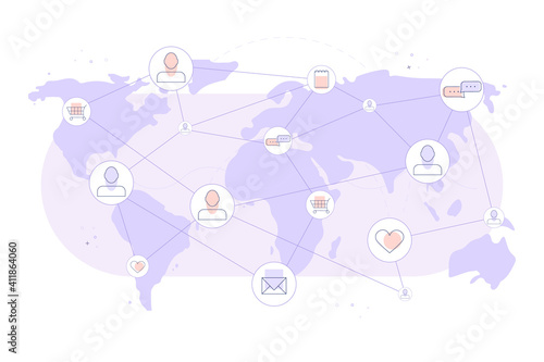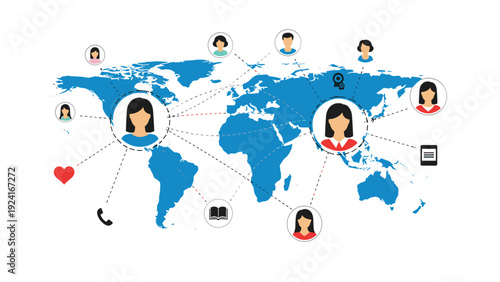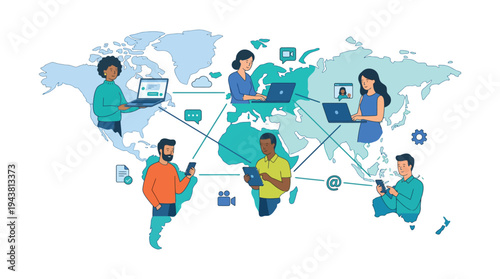 Outsourcing and worldwide connection concept. Distance learning or working around world vector. Student or employee team from different country online course or work remotely