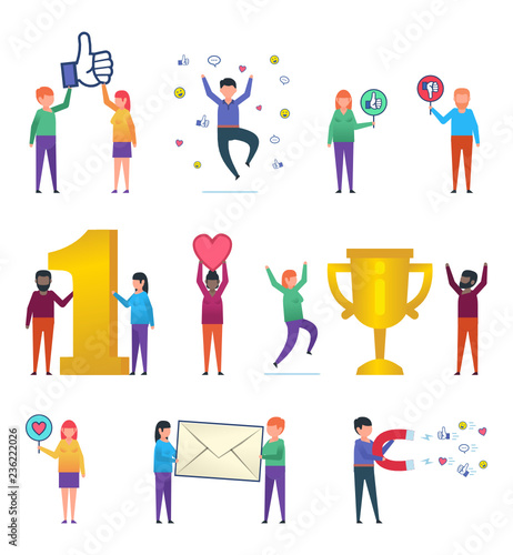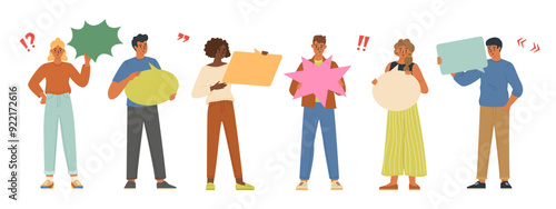Diverse multiethnic young people characters holding speech bubble set. Man and woman of various races standing with social media network dialogue chat box in raised arms vector illustration