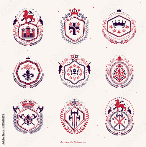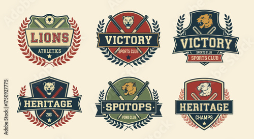 Diving school, shop, club vintage logo, badge, emblem set, vector illustration. Scuba diving, spearfishing, underwater swimming and hunting equipment and gear. Water recreational sport and leisure.