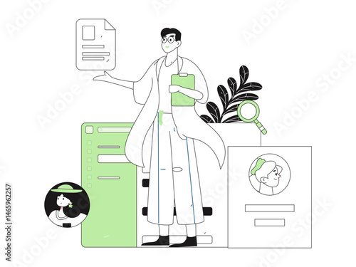 Tiny doctor characters examining male patient on computer screen, flat vector illustration. Online medical consultation, advice, online diagnosis and prescription medicine, telemedicine.