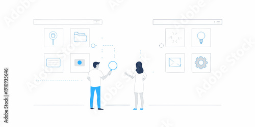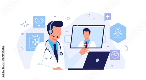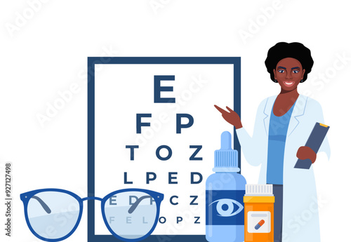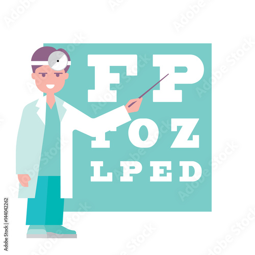 Doctor ophthalmologist eyesight check up, contact lenses, eye drops, flat vector illustration. Vision test and correction, eye health.