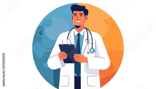 Doctor super hero wearing medical face mask and red cloak, flat vector illustration. Brave doctor ready to fight against corona virus disease covid-19.