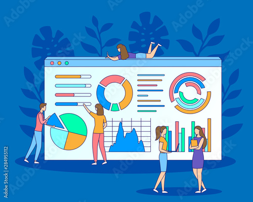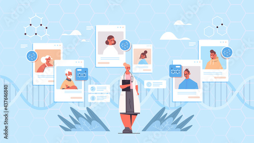 Doctor team treating patient online vector illustration. Professional therapist tiny person making blood analysis, diagnosis and treatment, discussing illness progress