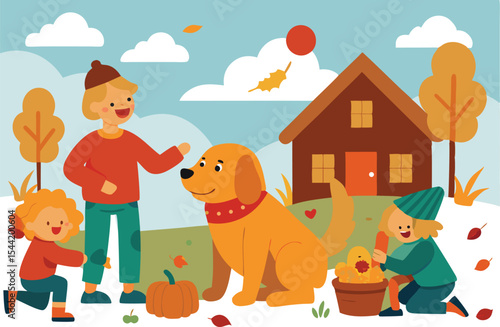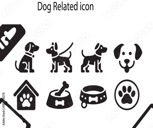 Vector illustration of tiny characters man pet owner keeping big dog on leash, woman with bone and other man with dry food. Dog products and supplies composition for pet shop website, web banner etc.