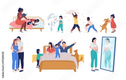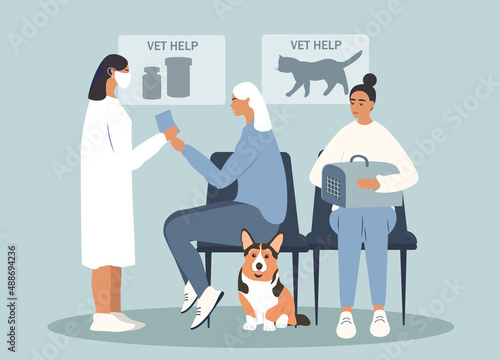 Dogs with winning medals sitting on winner pedestal and their happy owners celebrating victory, vector flat illustration. Dog contest, show, exhibition concept for poster, banner etc.