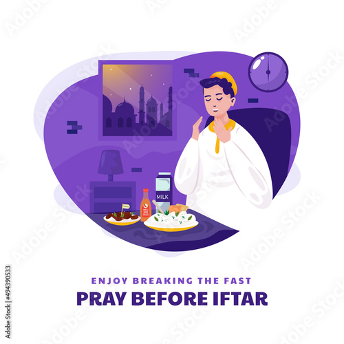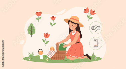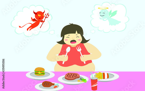 Dog eats sausage with her owner from dinning table. Home pet vector illustration. Woman is doing yoga meditation next to her dog. Animal lover lifestyle.