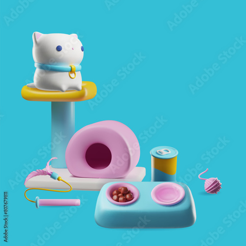 Dog food vector 3d poster. Vet shop assortment with meal package, canned preserves and sweet bone illustration. Cute puppy muzzle and nutrition