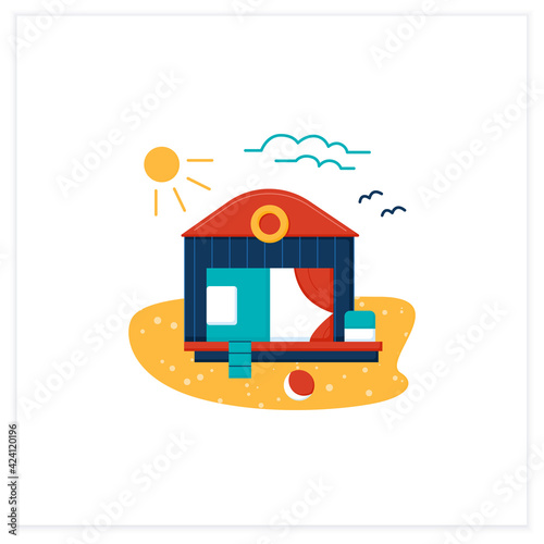 Dog in the house vector flat style design illustration. Doghouse, collar, food bowl, bones, shampoo, brush and scissors. Pet care, dog grooming supplies for web banner, website page etc.