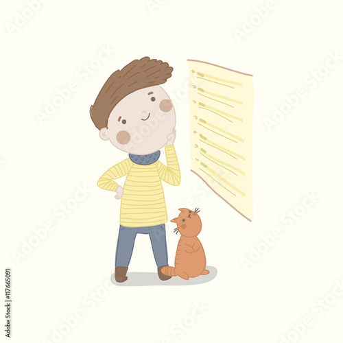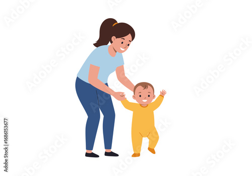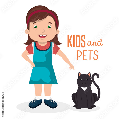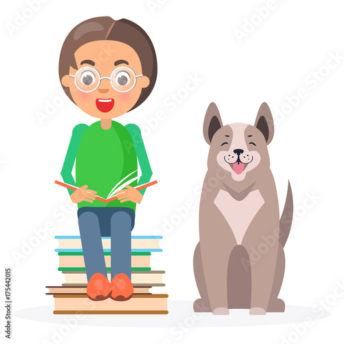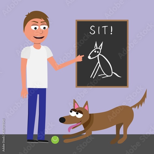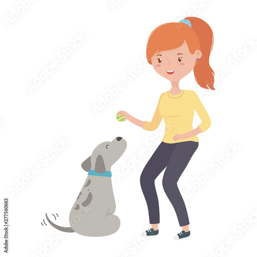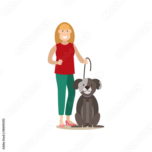 Vector illustration of woman with her dog, Pet owner and her puppy flat style design element, icon isolated on white background.