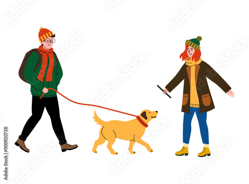 Happy male and female characters walking and playing with pet dogs, vector flat illustration isolated on white background. Dog walkers, trainers.