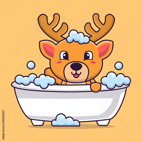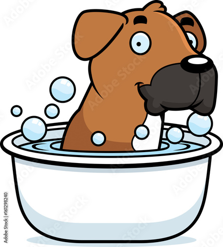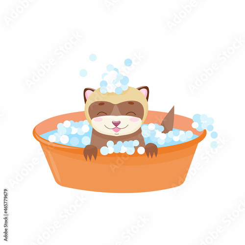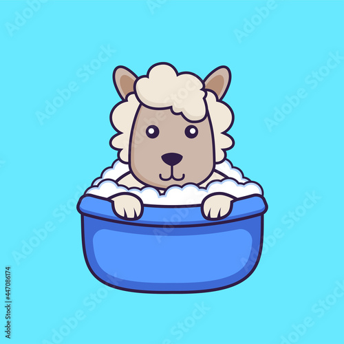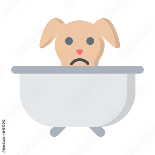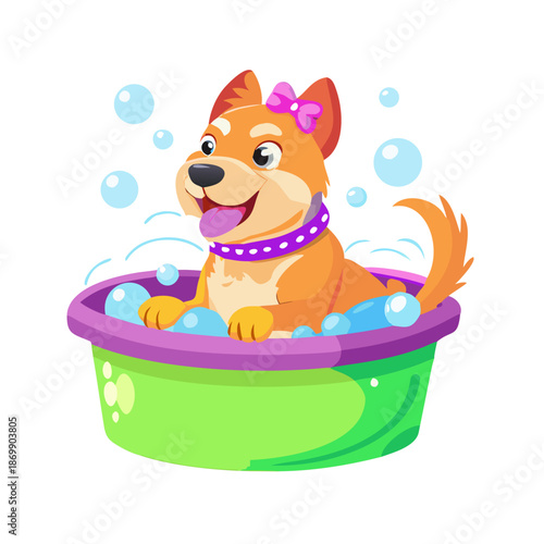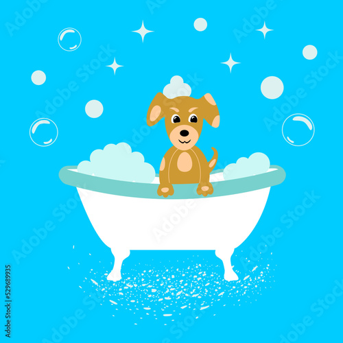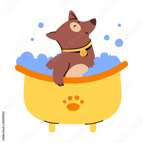 Dog washing in bath vector. Pet grooming cartoon icon. Animal spa. cute puppy in bathtub full of water and shampoo soap bubble isolated on white background. Canine hygiene and care