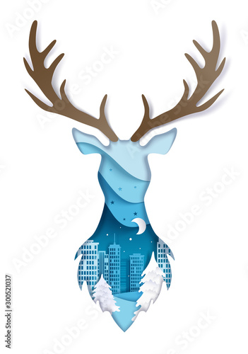 Double exposure vector layered paper cut wild deer head silhouette with winter night forest landscape inside. Winter trendy composition for greeting card, poster, banner, website page etc.