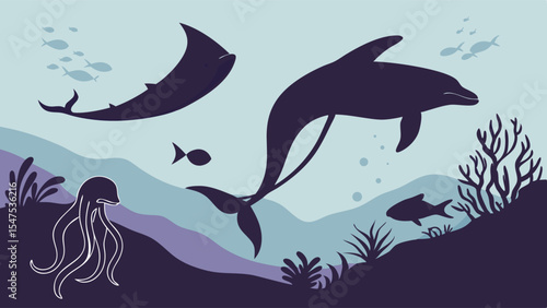 Double exposure vector layered paper cut large whale silhouette and underwater sea cave with coral reef, fish. Beautiful trendy marine composition for card, poster, banner, website page etc.