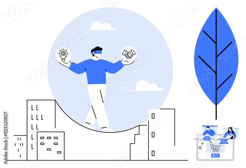 Downhill skiing, vector illustration in paper art modern craft style. Paper cut mountains and skier silhouette sliding down snow-covered slope. Winter sports and activities.