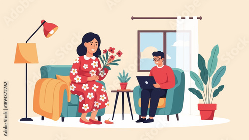 Dress model concept vector illustration. Clothing stylist and model girl trying on close-fitting trendy dress in flat style.