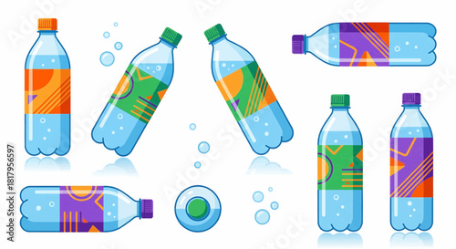Drinking water poster, banner template. Vector paper cut illustration. Mineral water plastic bottles, drinking glass, water splash and copy space.