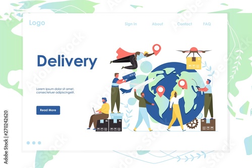 Drone air delivery concept. Drone with package landing on a map, courier fast shipping. Vector web site design template. Landing page website illustration
