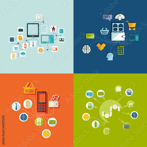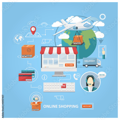 Drone delivery concept vector illustration with charts for delivery company. Modern express pizza, shoes and clothes delivery by unmanned aircraft flat symbols, icons.