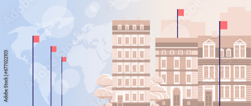 Drone delivery concept vector horizontal banner. Quadcopters delivering parcels to customers. Modern flat style design element for drone delivery business advertising.