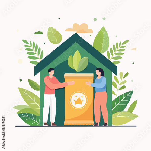 Vector illustration of dressmaker or clothing designer standing next to dummy dressed in new pink evening gown dress. Atelier, tailoring shop, fashion salon concept design element in flat style.