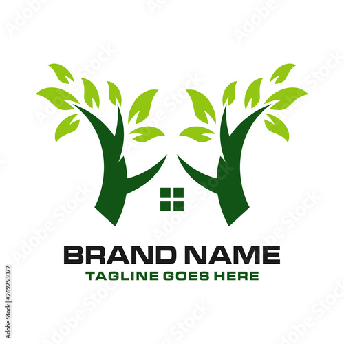 Tree inside of green house, vector illustration in paper art style. Ecology, save the planet, environment protection, eco house logo concept.