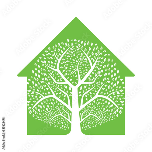 Eco smart home vector logo abstract design in paper cut art style. Renewable energy for private apartment building promotion illustration. Environmental and ecological technology