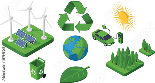 Ecology word with paper cut family characters riding bicycles with backpacks, eco friendly city, solar panels, windmills. Vector illustration in paper art style. Ecology typography banner template.
