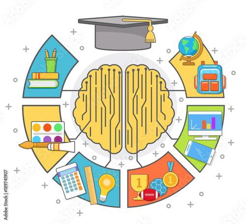 Vector education infographic template design with graduation cap and educational icons. Thin line flat style illustration.