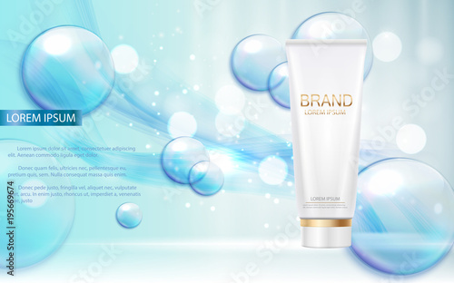 Effervescent vitamin C tablets ads. Vector realistic composition of soluble tablets pack, glass of water with fizzy pill, sparkling bubbles and copy space for poster, banner, etc.