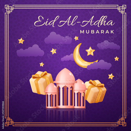 Eid al Adha poster card in 3d modern vector style. Eid Mubarak Islamic holiday banner with Ramadan lantern and moon. Ramadan muslim decoration and purple color background.