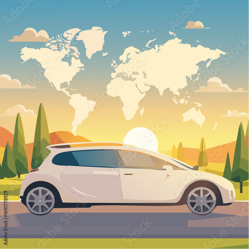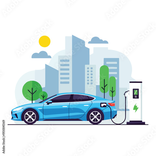 Electric vehicle charging station. Man recharging electric car with cable using energy from rechargeable battery, flat vector illustration. Eco-friendly car, ecology, environment protection.