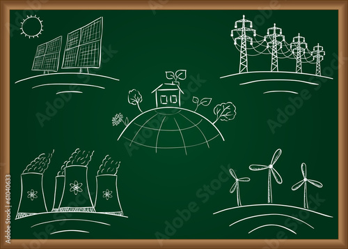 Electricity concept vector flat illustration. High voltage power lines, solar panel, light bulb, extension cord. Electric power production and consumption composition for web banner, website page etc