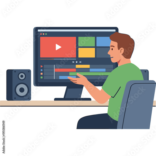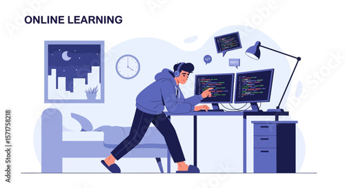 Electronics store, flat vector illustration. Home appliances, audio equipment, computers, smartphones on shelves, seller and buyer cartoon characters.
