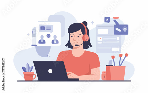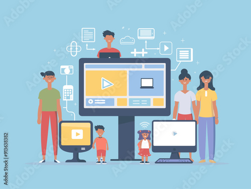 Electronics store, flat vector illustration. Home appliances, audio equipment, computers, smartphones on shelves, seller and buyer cartoon characters.