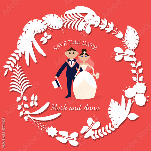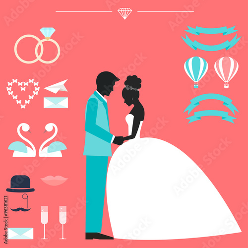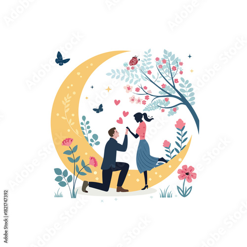 Elegant with card with proposal text will you marry me design. Wedding rings, traditional festive decor and romantic party accessories, bride and groom wearing elegant clothing vector illustration