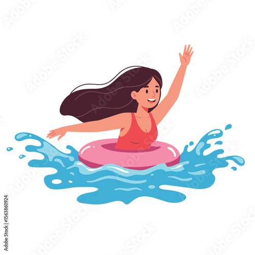 Elegant woman in swimwear and hat swimming in inflatable circle vector icon isolated on white background.