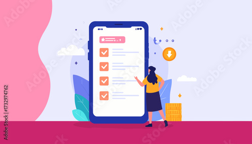 Vector flat illustration of big smartphone with letter in opened envelope, read message icon, tiny people sending and receiving electronic mail. Email newsletter and subscription, email marketing.