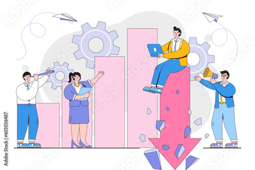 Micro male and female characters embroidering cup using huge embroidery tools and accessories pattern, hoop, needle, thread, pencil, vector illustration. Hand embroidery classes, craft hobby concept.