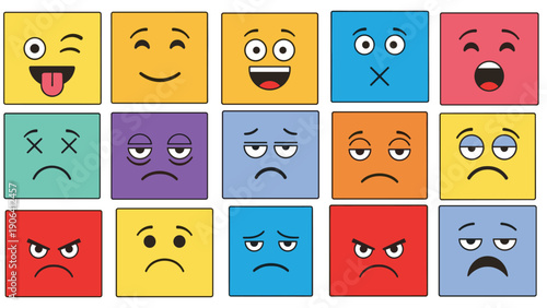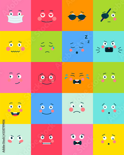 Emoji vector set. Cute cartoon emoticon showing bad and good opposite feelings illustration. Colorful communication speech bubbles square with kawaii face