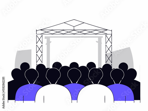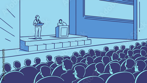 Empty conference hall with podium on stage, tv screen and seats for guests audience interior vector illustration. Modern auditorium for speech presentation, symposium and business training