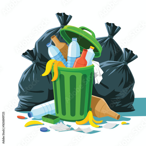 Empty trash bin or kitchen garbage container and full plastic trash bags, vector illustration. Food garbage, organic waste.