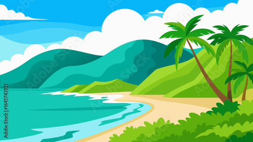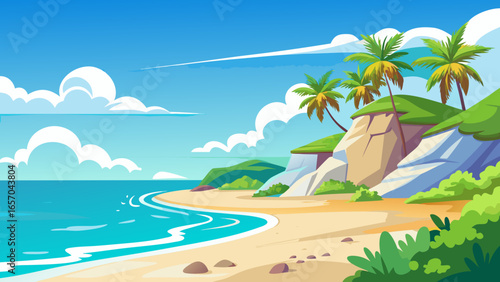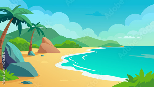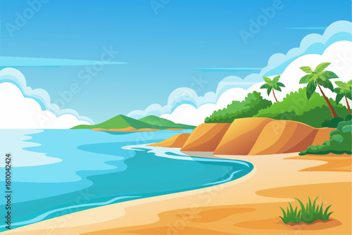 Empty tropical beach at resort vector illustration. Seaside of bay with warm water, sand, palm tree and mountain rock cliff at sunny day
