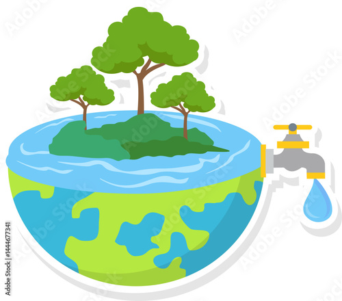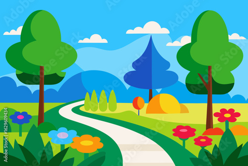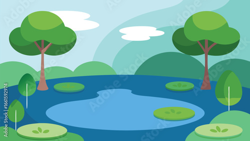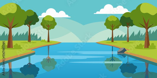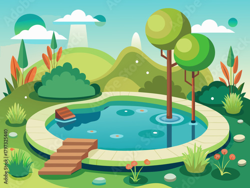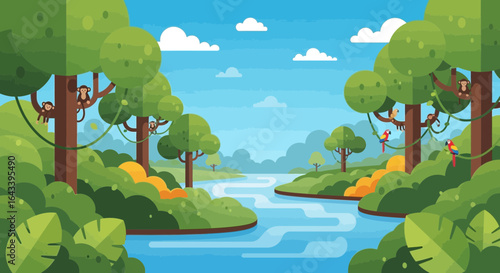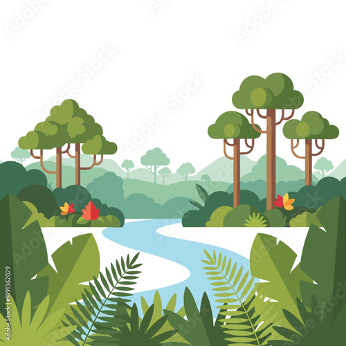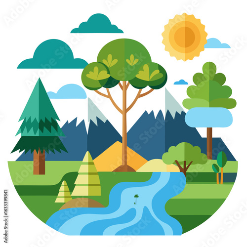 Enchanted waterfall flowing from mountain cliff over forest landscape papercut vector illustration. Fantasy stream, travel scenic and wild oasis panorama concept